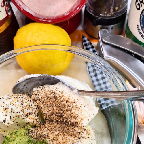 - Greek yogurt, garlic, vinegar, lemon juice, salt and fresh ground pepper.